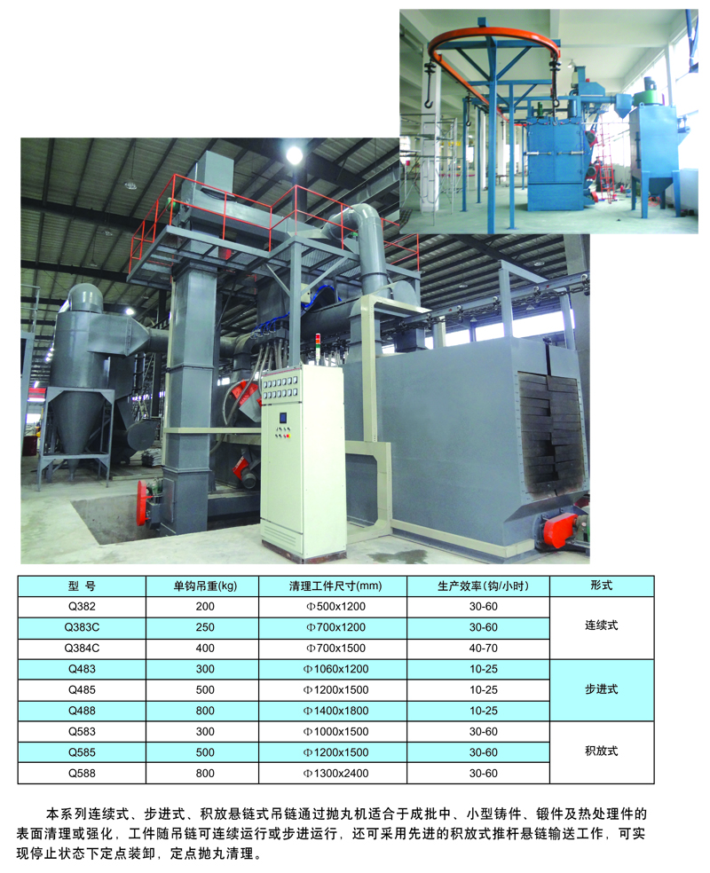 • 本系列連續式、步進式、積放懸鏈式吊鏈通過拋丸機適用于成批中、小型鑄件、鍛件及熱處理件的表面清理或強化、工件隨吊鏈可連續運行或步進運行,還可采用先進的積放式推桿懸鏈輸送工作,可實現停止狀態下定點裝缷,定點拋丸清理。