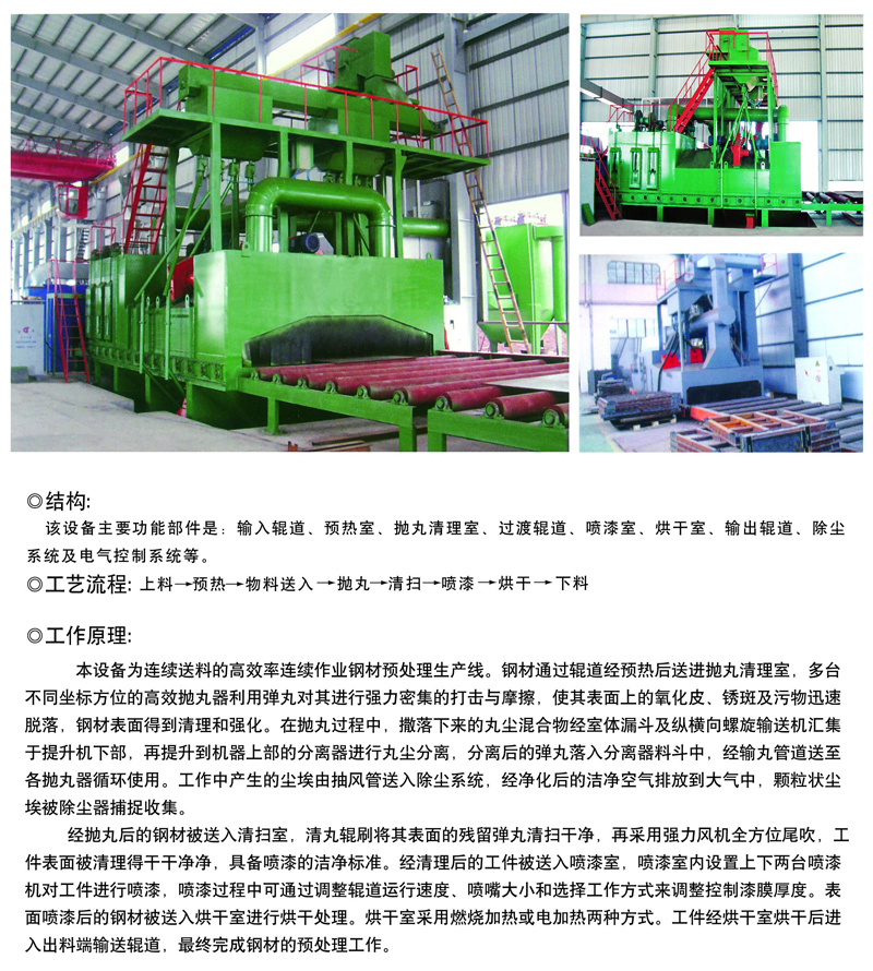 該設備主要功能部件是;輸入輥道、預熱室、拋丸清理室、過渡輥道、噴漆室、烘干室、輸出輥道、除塵系統及電氣控制系統等。